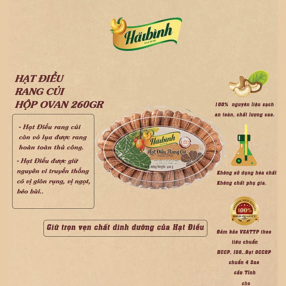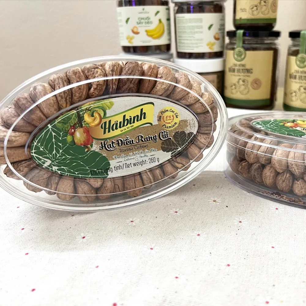 – Roasted cashews are a nutritious nut made from cashews that still have their outer shell intact. With a unique wood-roasting technique, completely handmade on a wood-roasting oven according to the traditional roasting method, the nutritional content in cashews is fully retained, the attractive aroma and crunchy nuts have a distinct flavor, creating a unique flavor. a great snack.